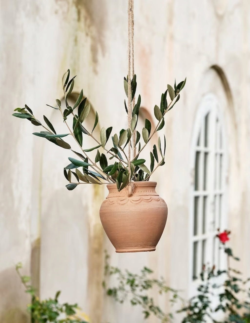 Handgemaakte plantenbak van klei met jutekoord om op te hangen. Het decoratieve snijwerk maakt het vat buiten tot een bijzondere blikvanger.