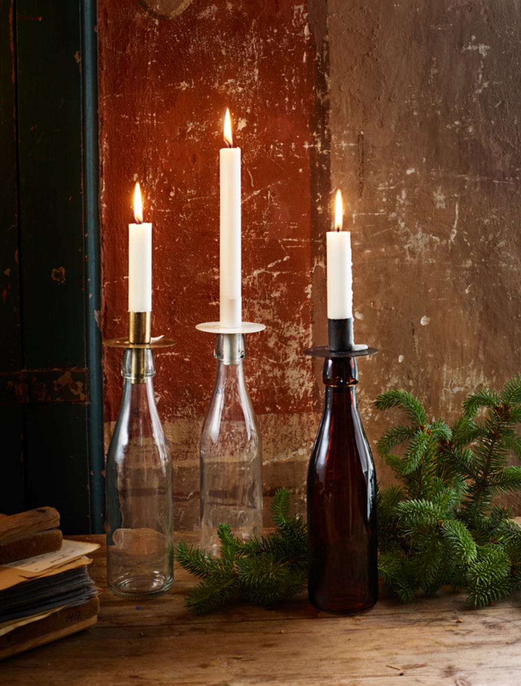 Een kandelaar waarvan de houder naar eigen inzicht kan worden vormgegeven - afhankelijk van welke fles wordt gebruikt en of deze gevuld of versierd is.