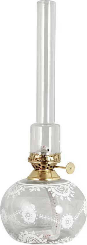De Marja paraffinelamp combineert nostalgische elegantie met moderne flair. Het ronde heldere glas is vakkundig versierd met delicate bloemen en wordt gecompleteerd door een elegante messing brander en een glazen branderbuis. De lamp geeft een warm, romantisch licht in elke kamer en is geschikt voor zowel klassieke als moderne interieurs.