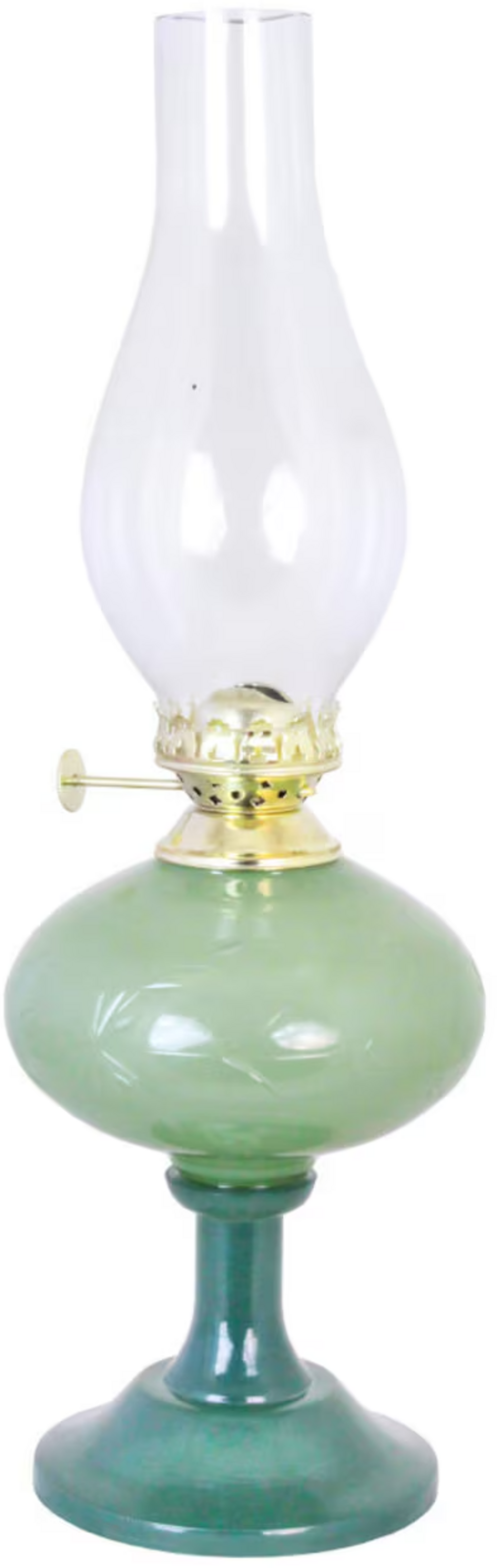 Deze prachtige petroleumlamp met een elegante, groene glazen voet en subtiel geëtst patroon straalt de charme van vervlogen tijden uit. Hij creëert een gezellige sfeer en past perfect in moderne woonruimtes.