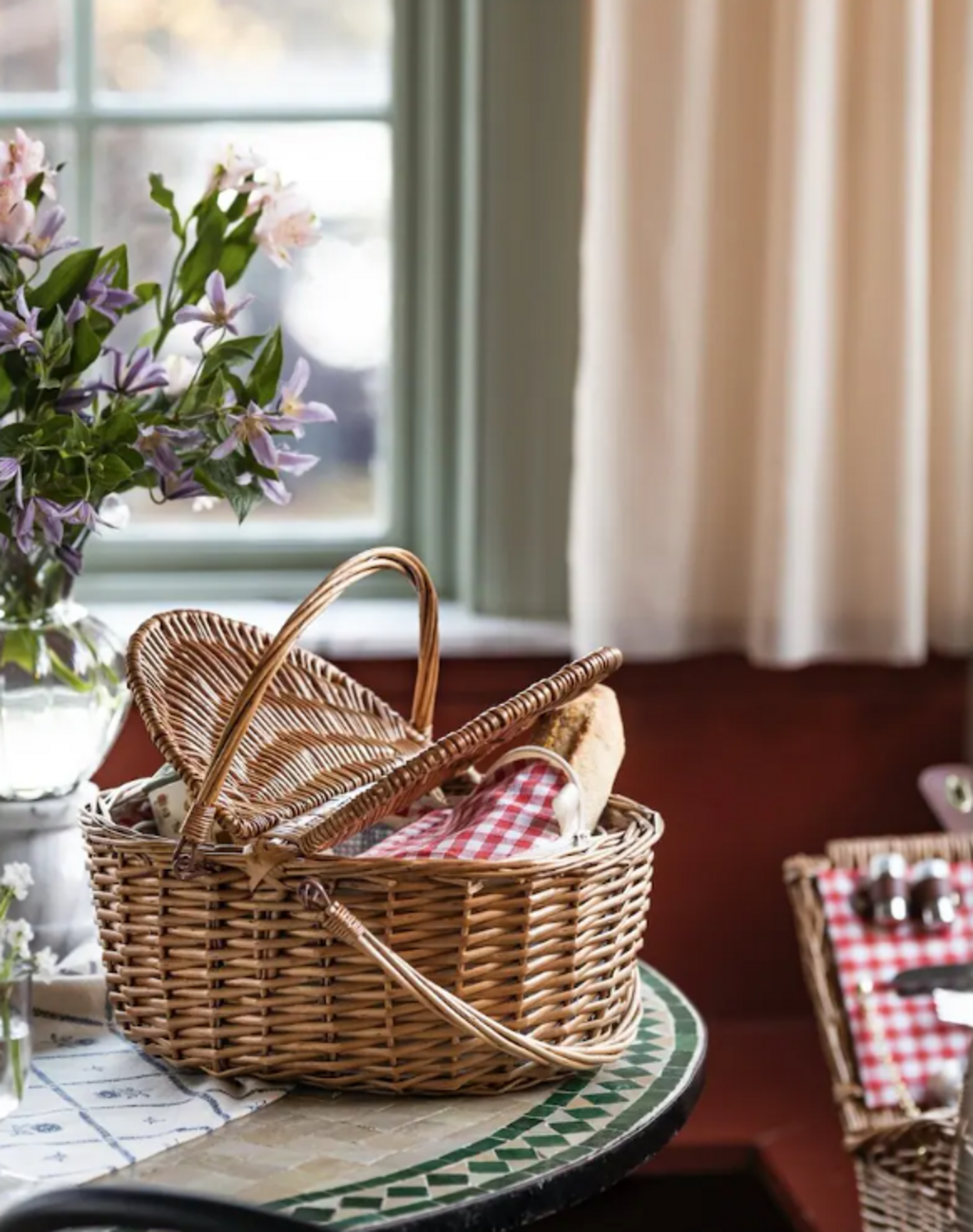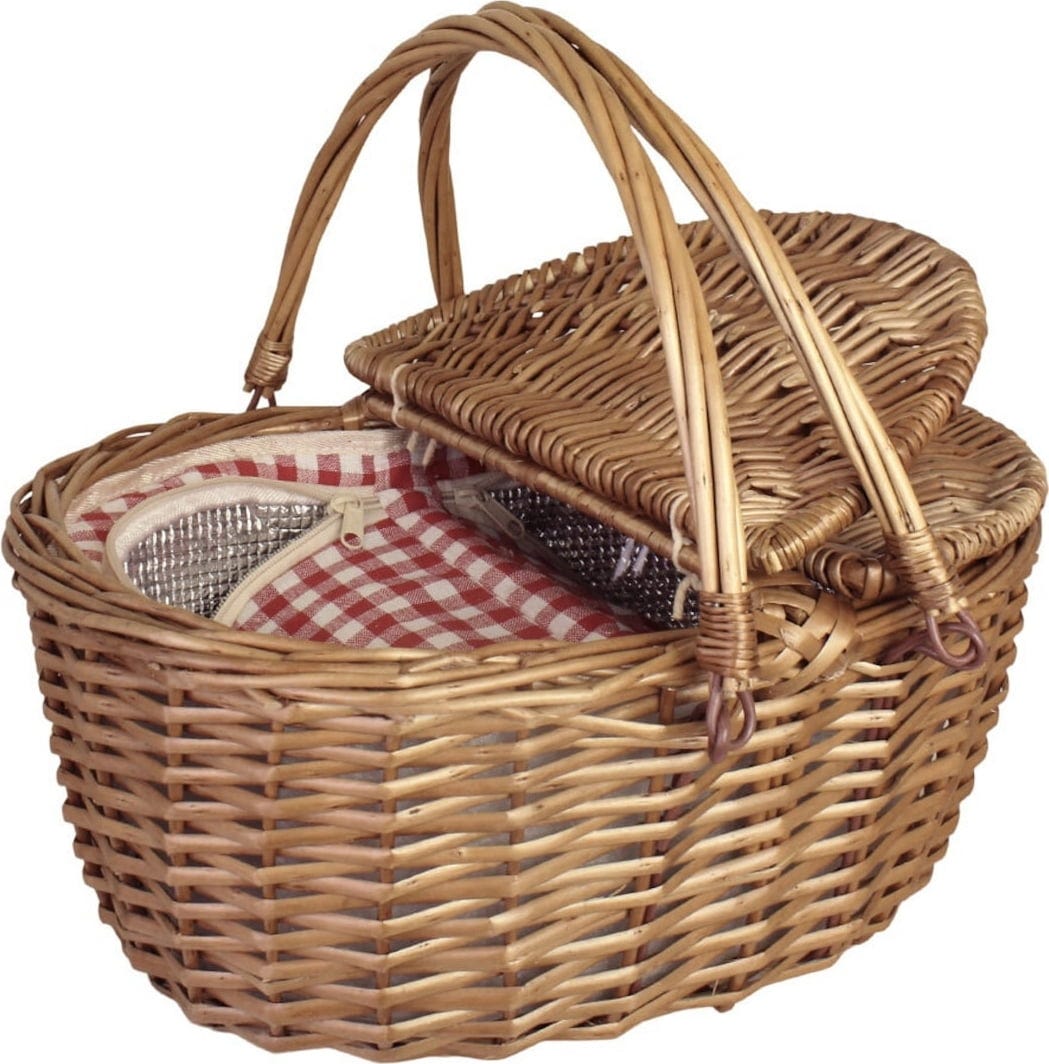 De rood-geruite stoffen voering onderstreept het klassieke picknickkarakter en maakt van deze koeltas een stijlvolle metgezel voor ontspannen uren in de buitenlucht.