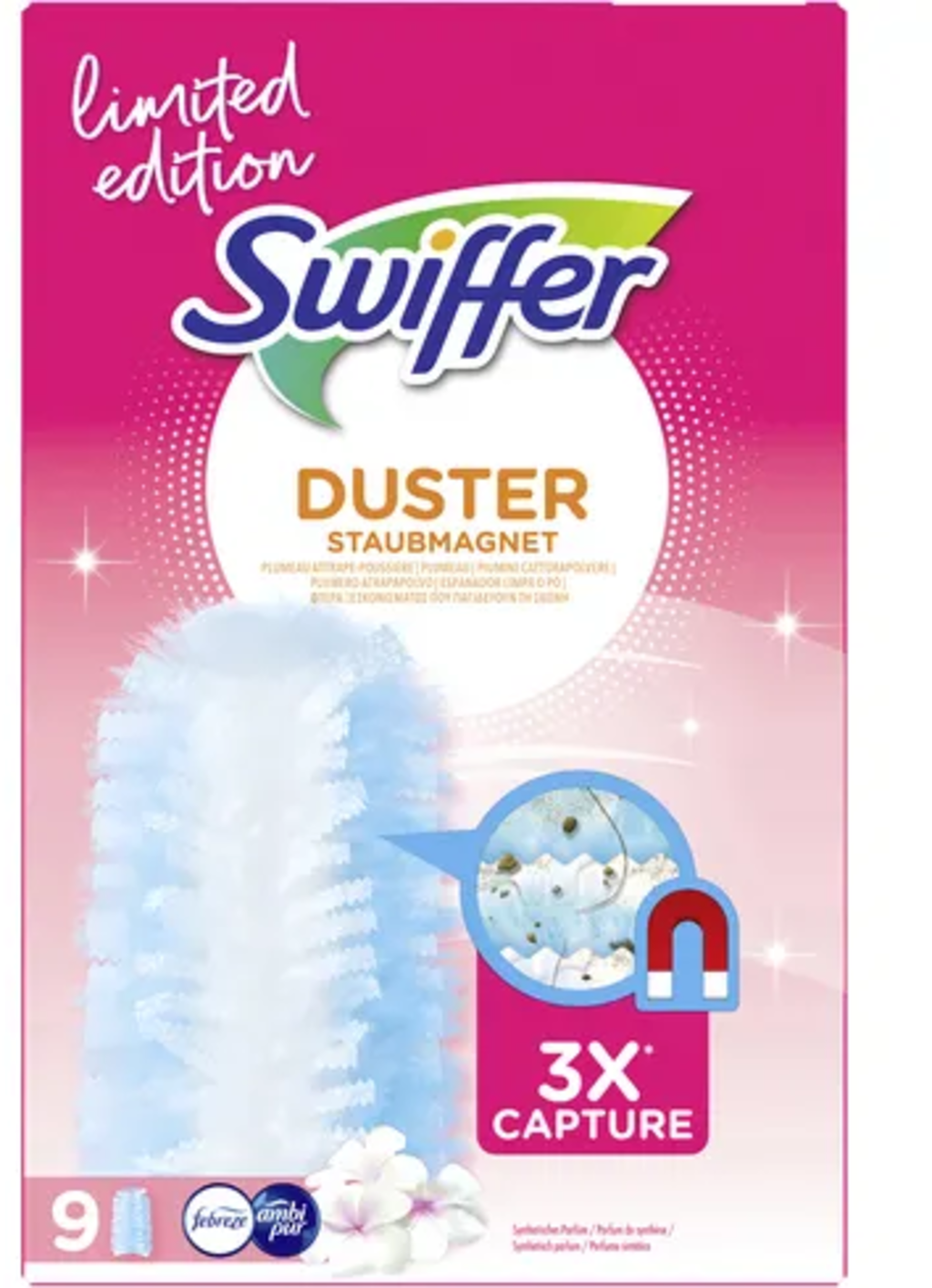 Ben je al in het bezit van het Swiffer handvat? Dan heb je alleen nog de Duster Stofdoekjes nodig. In de roze verpakking ontvang je 9 geurige stofdoekjes, die een bloemige, frisse geur van frebreze en ambipur hebben. Talloze flexibele en pluizige vezels dringen door tot in nauwe kieren en nemen met één veegbeweging stof en haren op. Ideaal om elke dag snel en grondig af te stoffen!