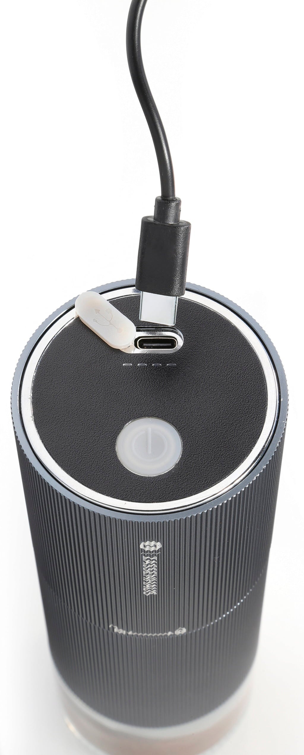 Met de MASTER USB koffiemolen kun je genieten van versgemalen koffie - thuis, op kantoor of onderweg. Het enige wat nodig is, is een druk op de knop: De robuuste roestvrijstalen molen werkt gelijkmatig en behoudt de volle smaak van je bonen. Je kunt de maling moeiteloos aanpassen, van espressofijn tot filterformaat. Het poeder valt direct in het glazen reservoir en is direct klaar voor bereiding. Modern, compact en perfect voor iedereen die van goede koffie houdt.